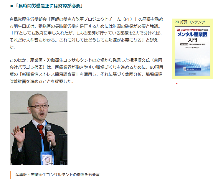 日本医事新報社によるWeb医事新報2019年5月10日号NEWS にて、メンタル産業医で知られる合同会社パラゴン(本社:東京都港区)代表の提言が以下のように取り上げられました。