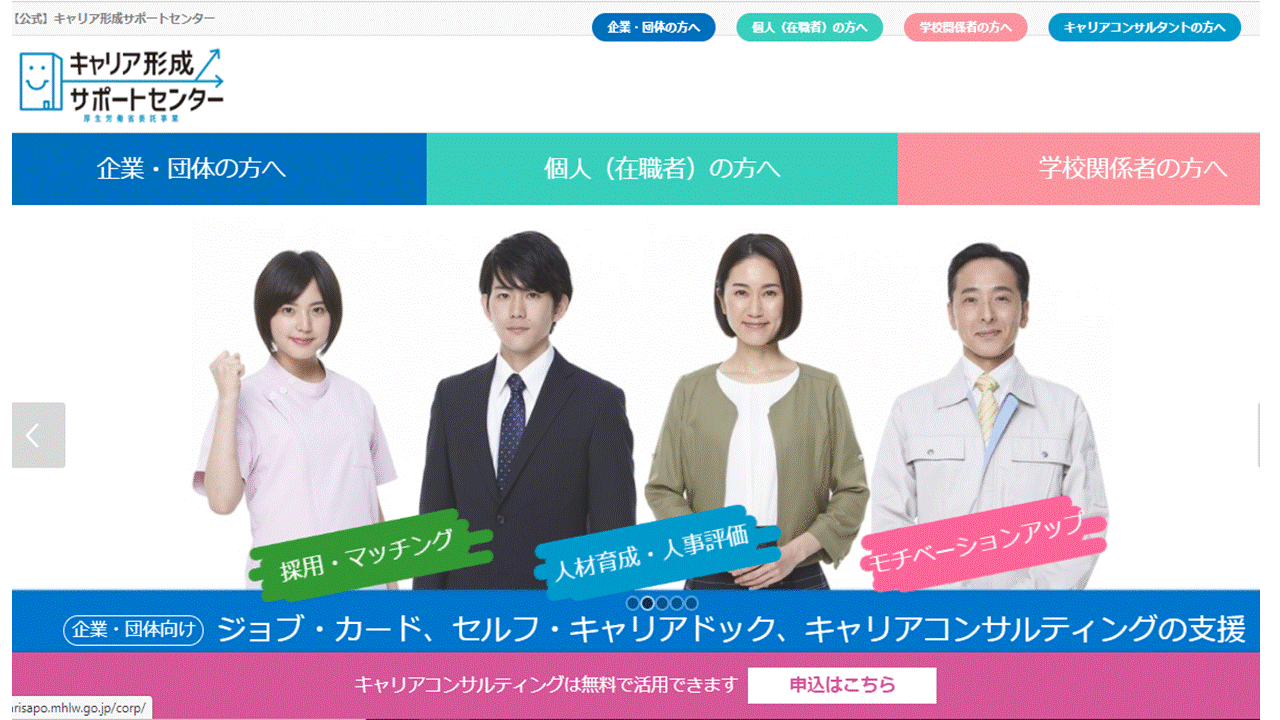 ジョブ・カードやセルフ・キャリアドックを活用しながら、無料のキャリアコンサルティングを受けながら、労働者が主体的に、そのキャリアの形成とキャリアを指向した職業能力の開発が可能となる総合的支援センターです。