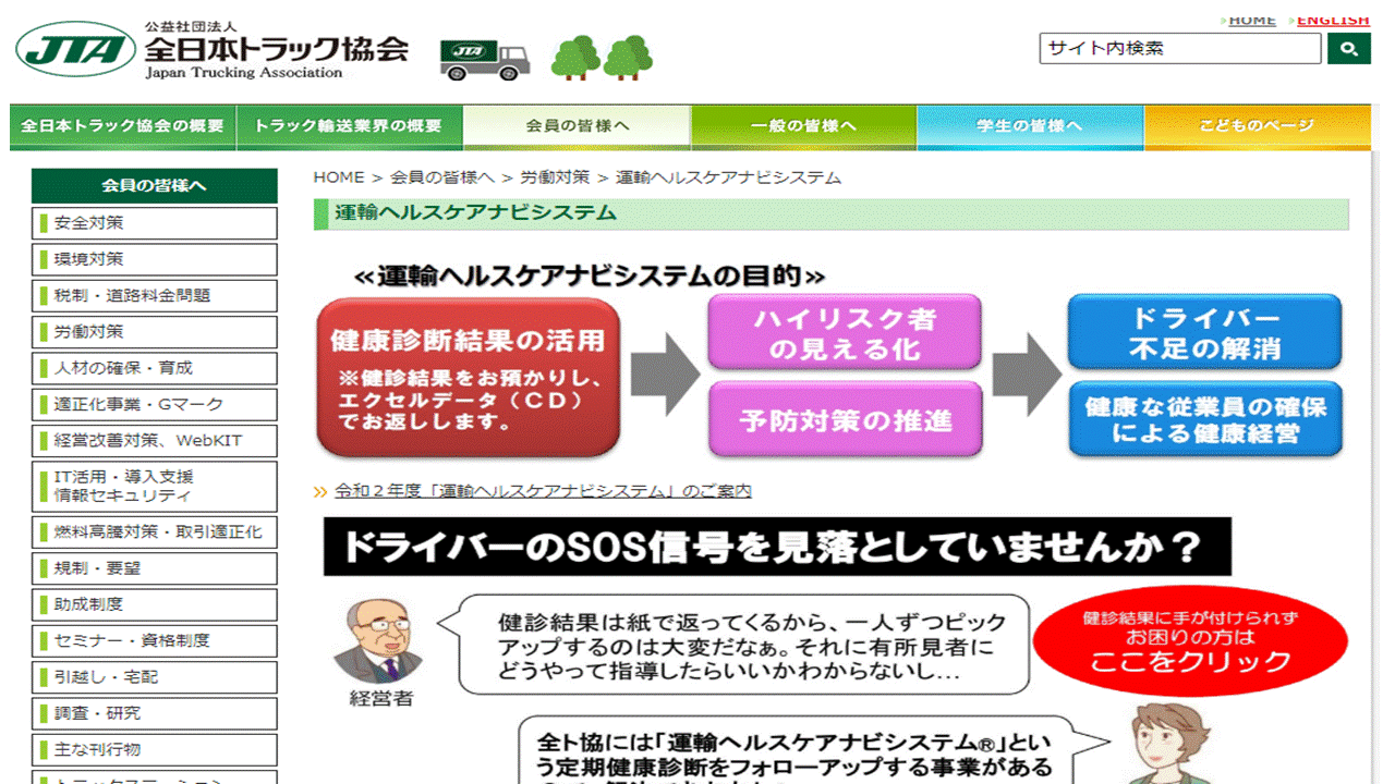 「運輸ヘルスケアナビシステム®」とは、全日本トラック協会(東京都新宿区)が、定期健康診断の事後措置の徹底を図る支援の一環として2017年に構築したトラック事業者に特化した健康支援システムです。