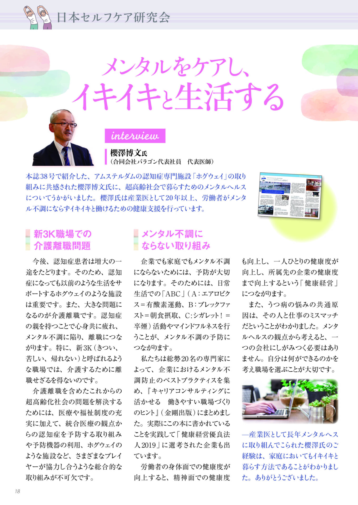 例えば横浜市青葉区の地域誌「あざみ野STYLE」が2019年9月刊行の第39号にて、当社代表に対する取材記事「メンタルケアし、イキイキと生活する」を「健康経営優良銘柄」選定制度の立役者である江崎偵英氏の記事と共に掲載くださいました。