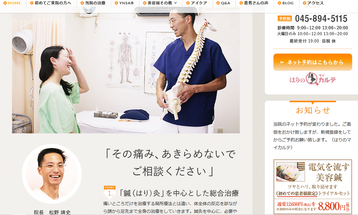 また、「その痛み、あきらめないでご相談ください」という優しい言葉かけからわかるように、患者様の気持ちに寄り添いながら、一人ひとり違う痛みに 真摯に向き合い、誠実に治療効果を出してきた自信が伝わってきます。
