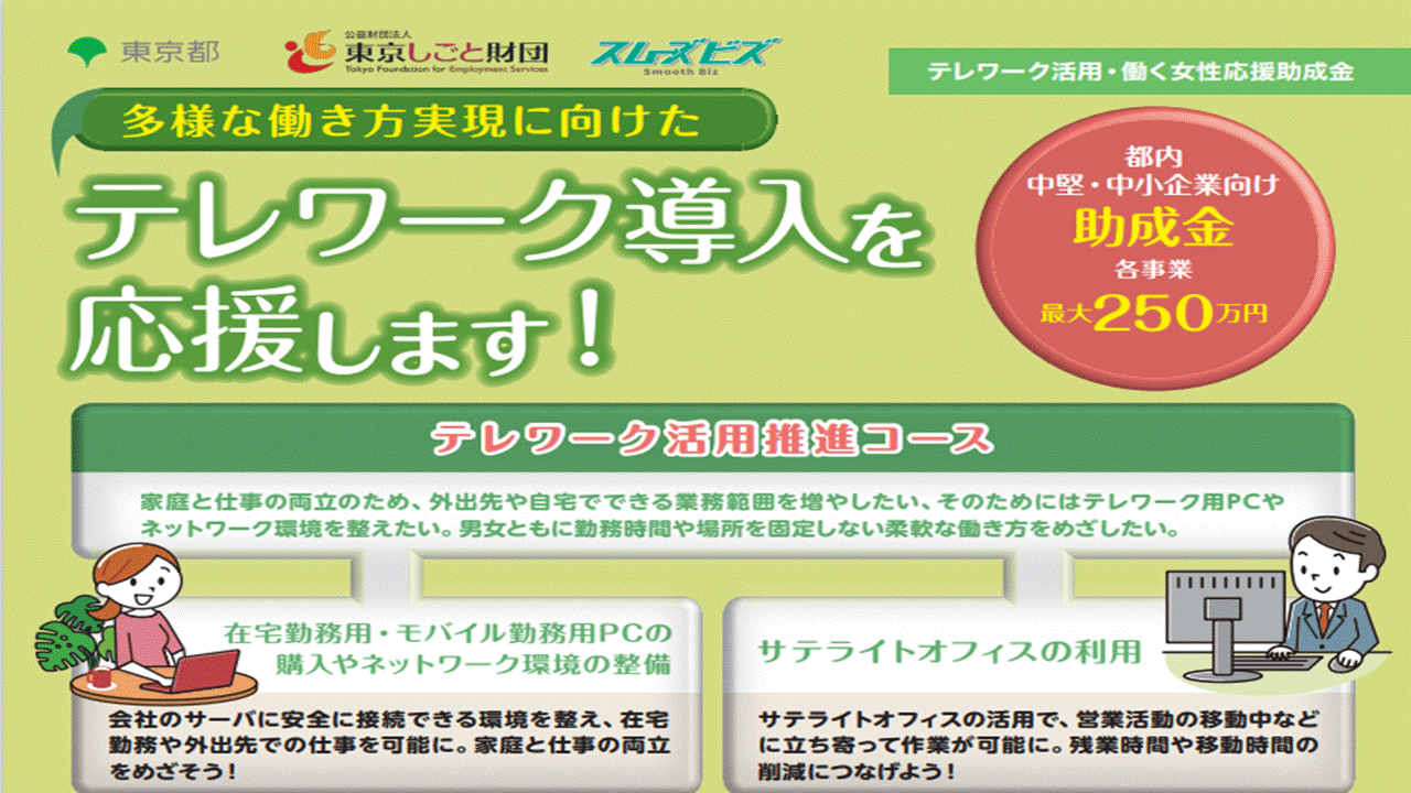 参考サイト:テレワーク活用・働く女性応援助成金(テレワーク活用推進コース)