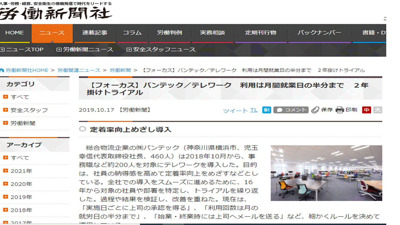 ストレスチェック実施後の働きやすい職場づくりを通じた健康経営に長けたメンタル産業医の命名者として知られる合同会社パラゴン(東京都港区)の支援先である㈱バンテック(神奈川県横浜市、児玉幸信代表取締役社長、460人)が導入したテレワークが労働新聞「フォーカス」2019年10月17日にて紹介されました。