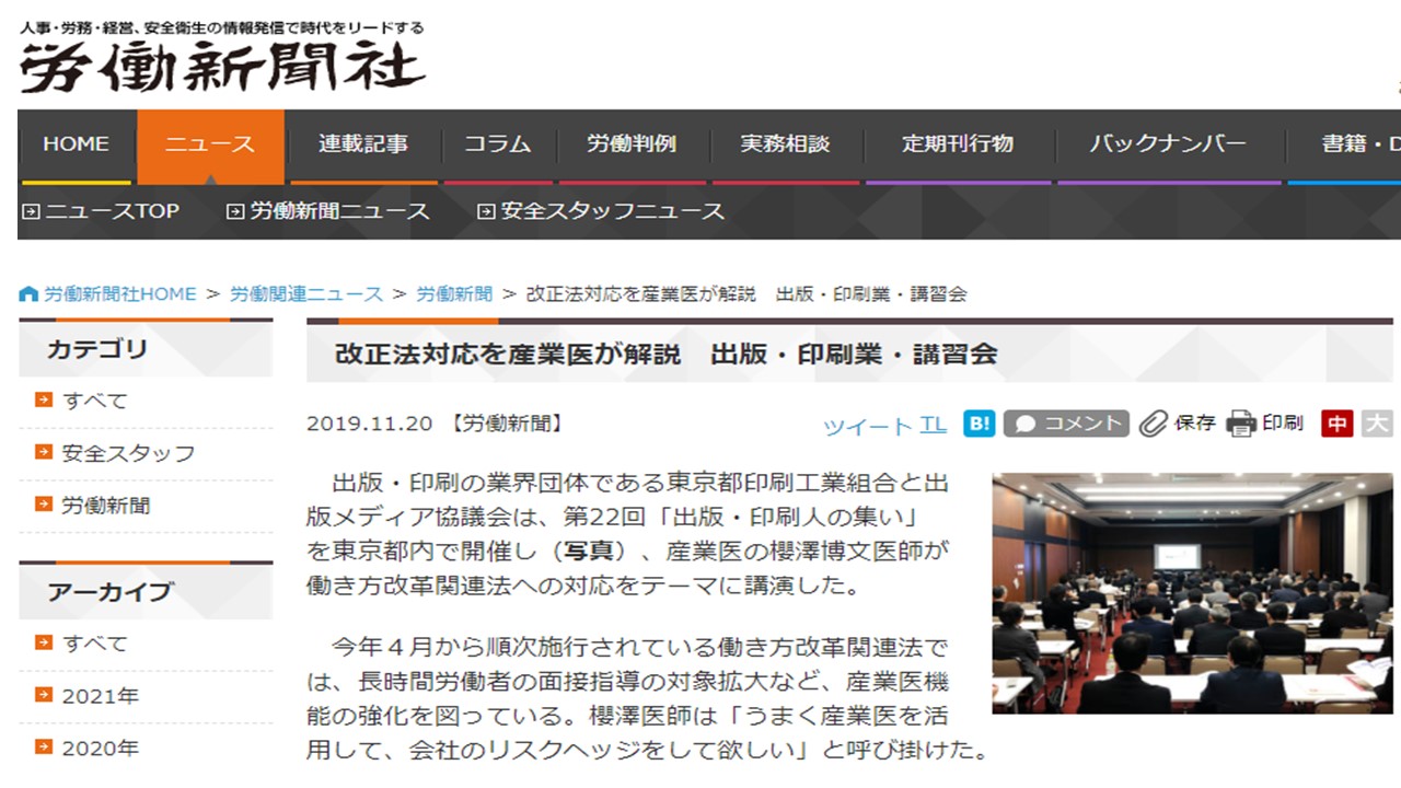 人事・労務・経営、安全衛生の情報発信で時代をリードする「労働新聞」が、2019年11月5日開催の東京都印刷工業組合出版メディア協議会主催 「第22回出版・印刷人の集い」でのプロフェッショナル産業医で知られる合同会社パラゴン代表による「メンタル産業医がひもとく 働き方改革関連法への対応」という題での講演会の模様を以下のように報じてくれました。