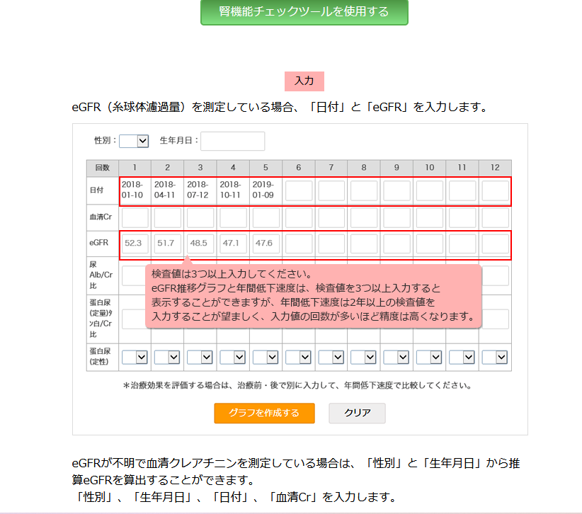 その腎障害としての区分・・・具体的には病期分類も必要になります。それも自動計算できたらどんなに便利でしょうか。 それが「腎機能チェックツール」 です。「eGFR」の推移をグラフ表示することも可能です。