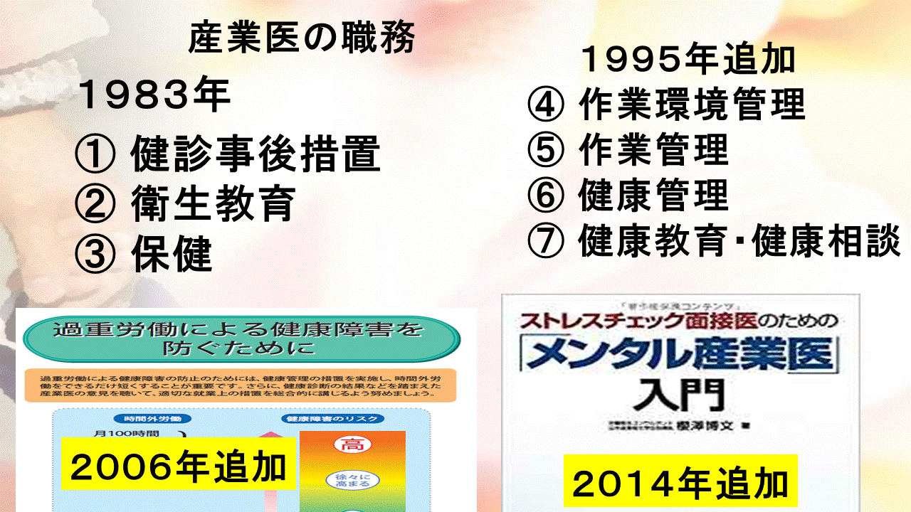 その頃は主に労働者の健康管理という、いわば自動車部品の品質管理よろしく、労働力の品質維持に産業医は投入されました。人材の材が、部材や商材、材料と変わらない時代でした。